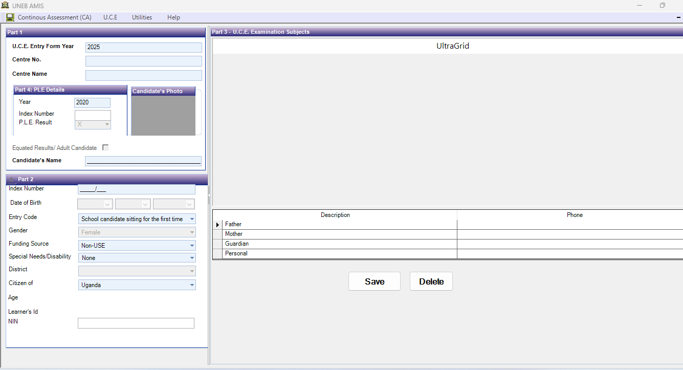 This is a desktop application provided by UNEB that schools install on their computers. It allows data entry for candidate details such as name, gender, date of birth, subjects, and photograph.